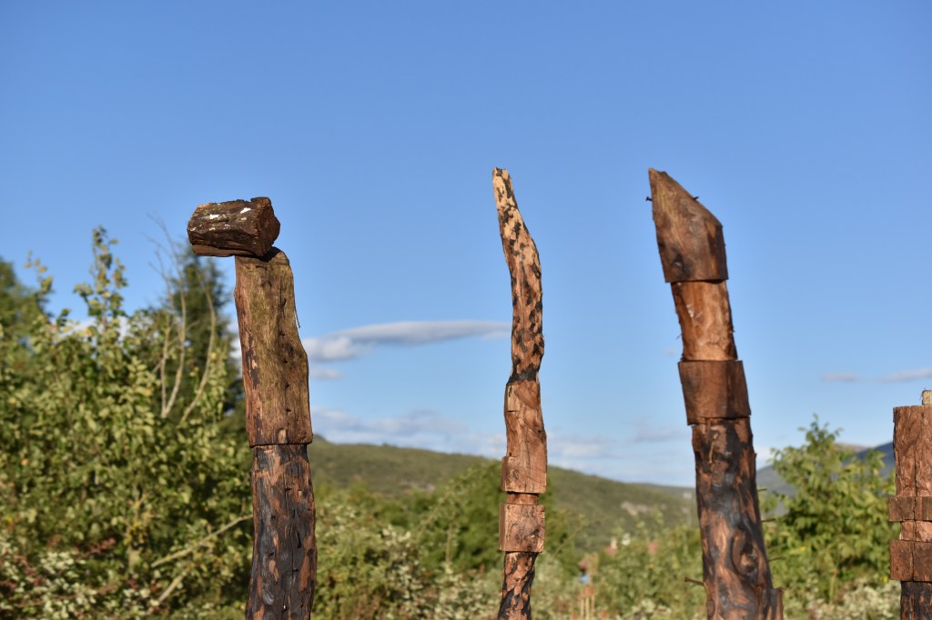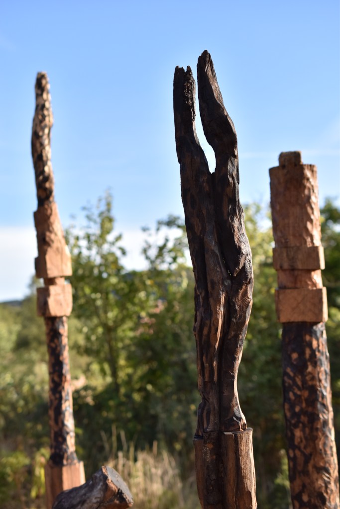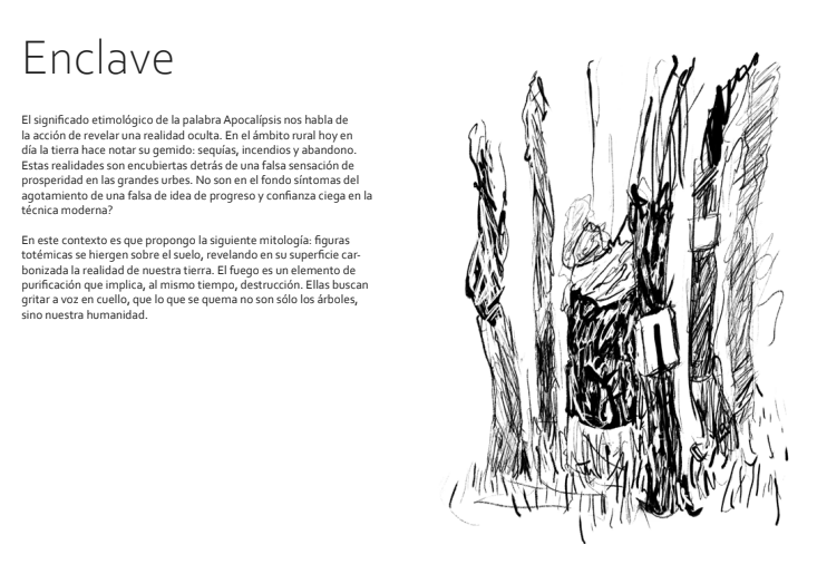 In this definition, the rural areas are oft thought of as ´sacrifice areas´ that need to be kept lagging behind because only the promise of ´modernization´ is the way to save them. In order to overcome this myth, I create a new one that can provide us with a path out of the void of production and consumption. Enclaves made of charred wood appear on the landscape, deities made of our burned dreams of progress and technocracy. On their surface, they show us that what burns is not only the trees but our humanity.