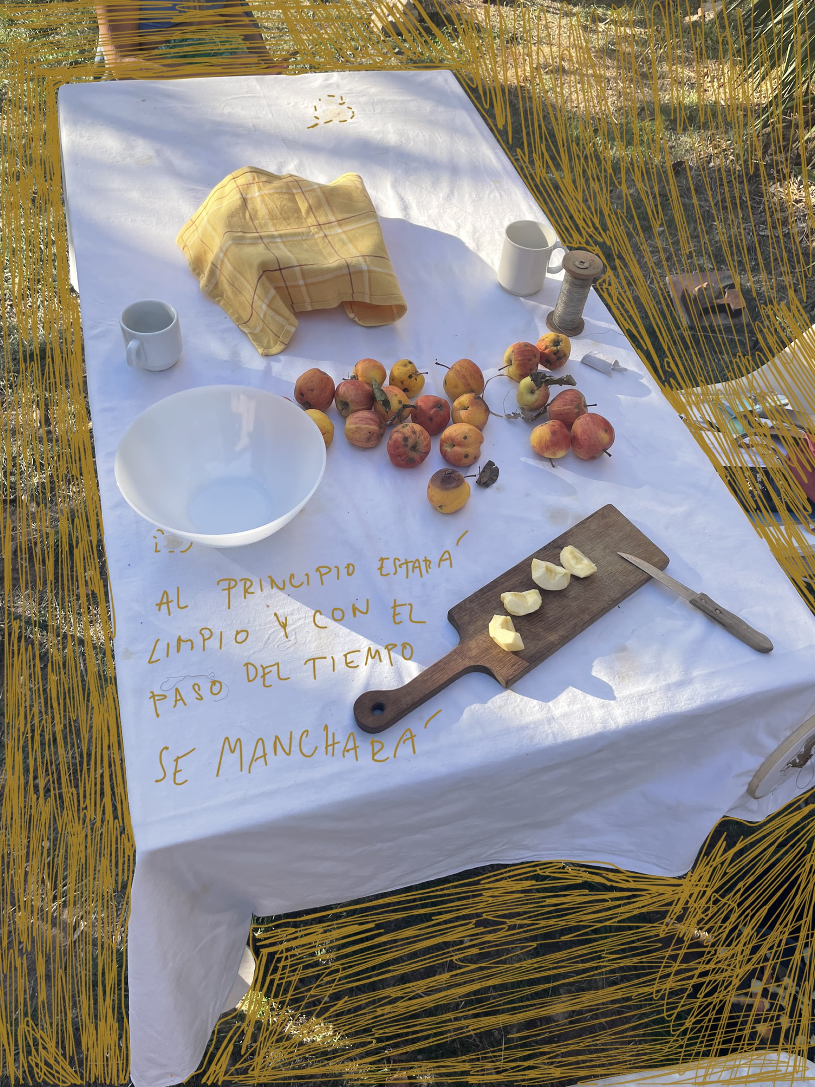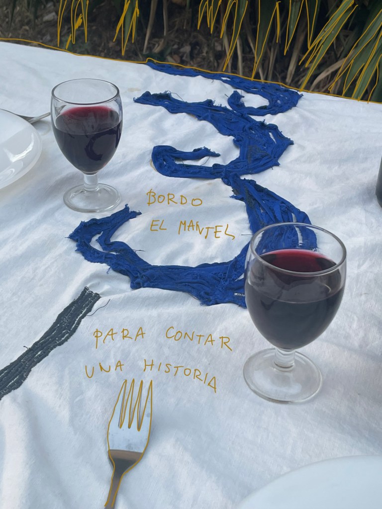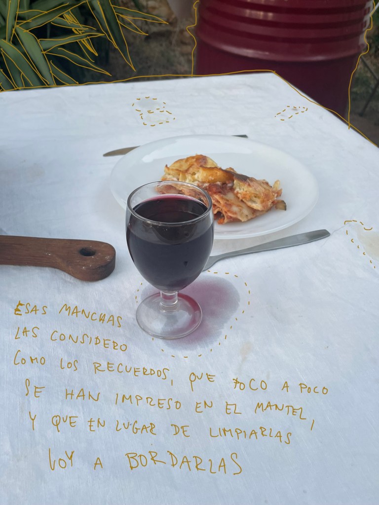 Formally it is a multimedia project, consisting of several events of sharing food at a table with the sharing food on a table with a tablecloth. This tablecloth functions as a physical record of these events. At first it will be clean and over time it will become stained. I think of these stains as memories, which have gradually, little by little, have been imprinted on the tablecloth. Instead of cleaning them I will embroider or modify them in another way.