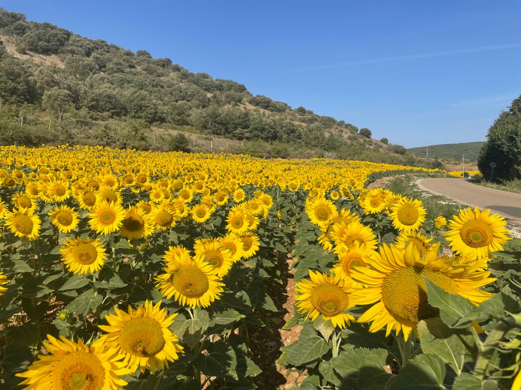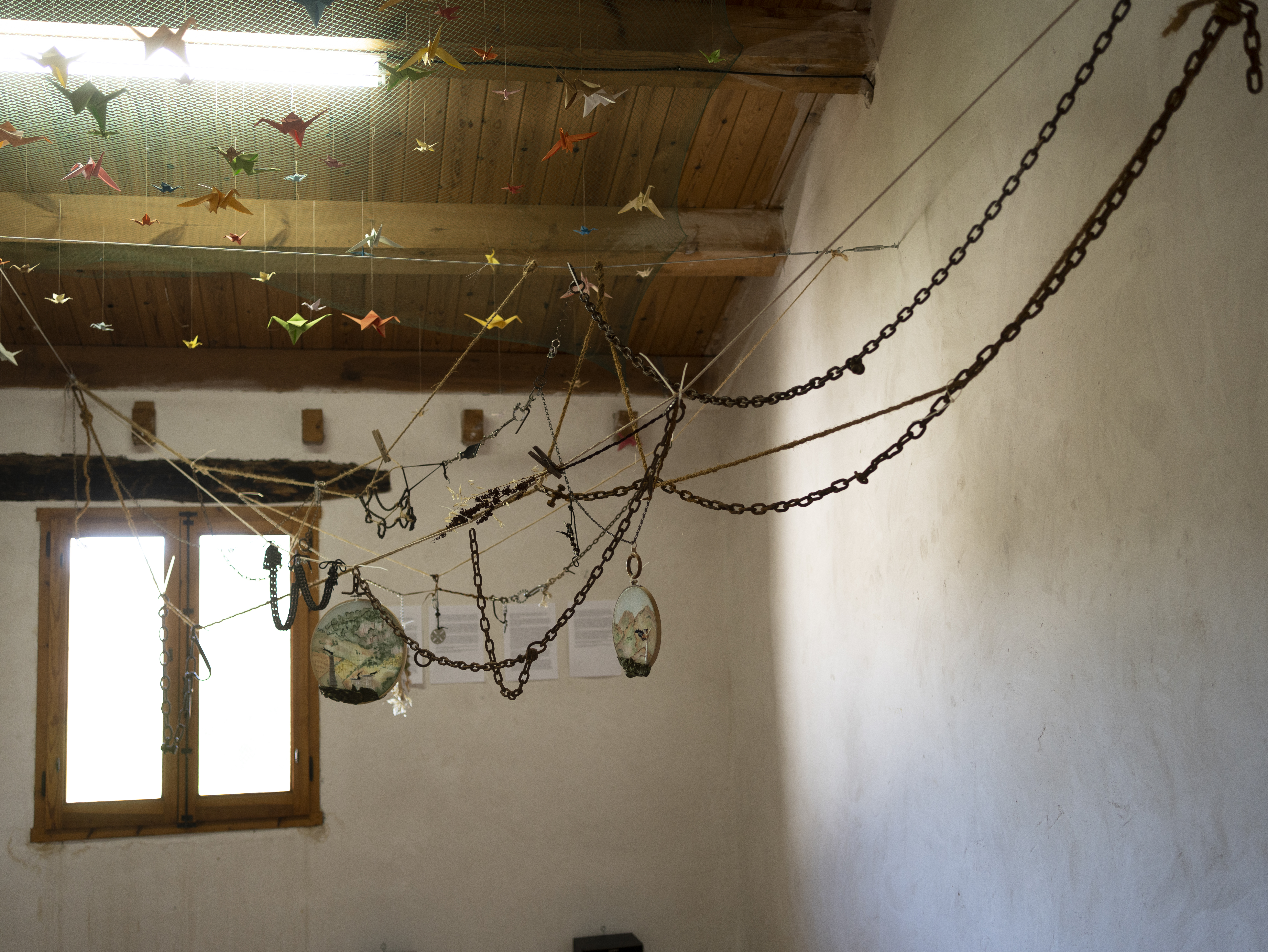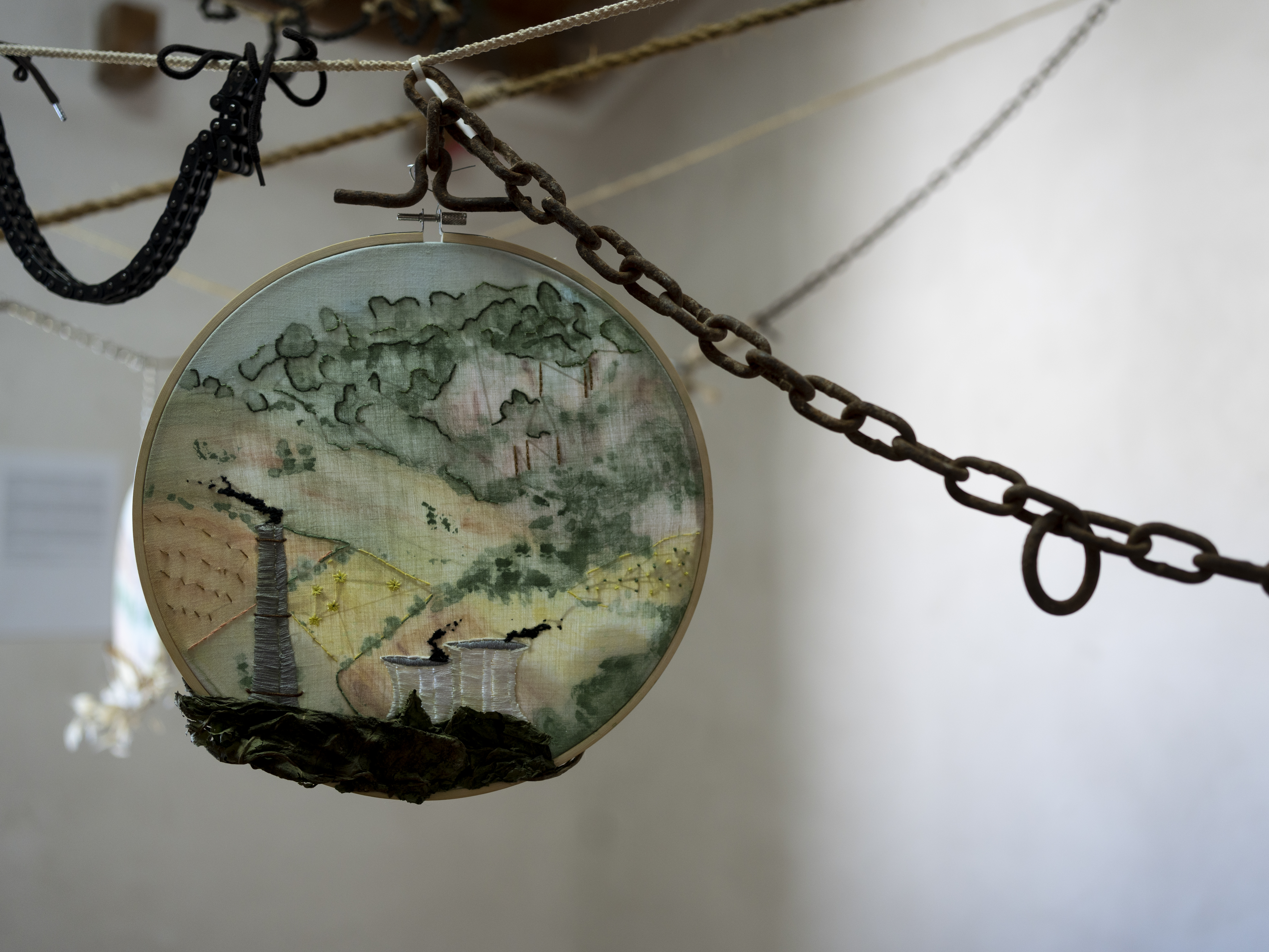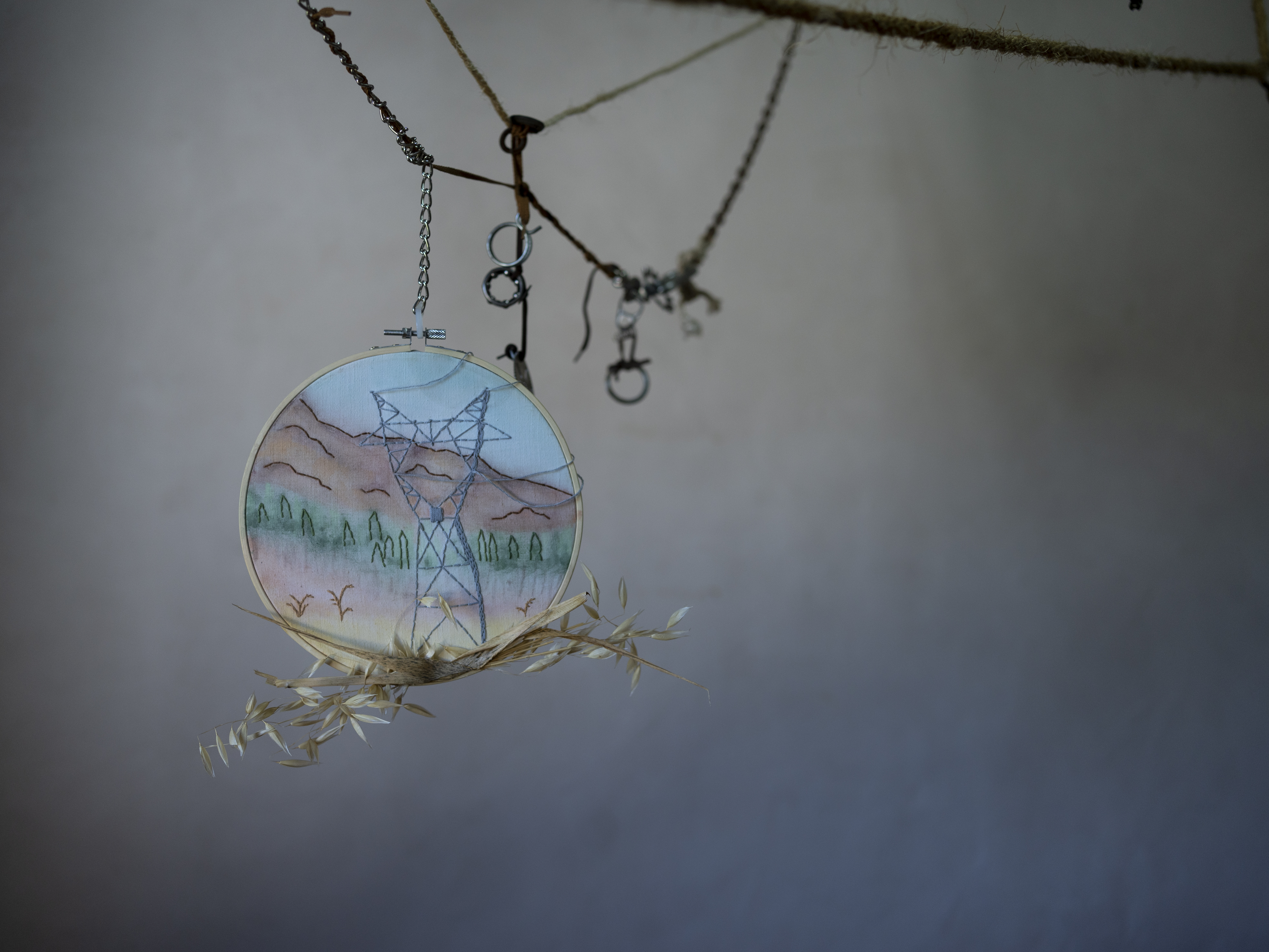 In each of the embroidered pieces you will see a source of power and/or energy depicted against the backdrop of the beautiful Spanish countryside. A windmill on fire (a story told to us by a local farmer), a defunct nuclear power plant (Santa Maria de Garoña), and an electrical tower. In the case of the windmill, it is meant to bring a renewable energy source but, if struck by lightning or otherwise combusted, it slings melting plastic to the ground with fiery propellers (you can see examples of this in Grant’s short film). The nearby nuclear plant was abandoned because of political and economic tensions, as well as workers reporting inefficient protections against the harmful effects of radiation. Finally, electrical towers speckle the land, zinging with the sounds of transmitted energy, but sending it away from this region, toward Madrid and other large cities. These machines…are they our monsters? Or the gods that will rule our future mythology? This region has become a “sacrifice zone,” dedicated to energy and food production, but not to the people living here, and the earth they till. Furthermore, who owns the machine? Who owns the tractor?